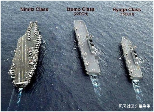 從左至右:美軍(也是世界)最先進的尼米茲級航母,日本出雲號、日本日向號