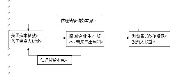 戰後,英法迫切需要獲得賠款以重建經濟,而德國的經濟遭到戰爭重創,無力賠償。1924年4月9日美國銀行家道威斯擬定了“道威斯計劃”,經各國討論通過,同年9月1日生效。該計劃主要內容為:協約國貸款 8億金馬克(摺合1.9 億美元),發行110 億金馬克鐵路公債、50億金馬克工業公債;規定德國賠款年度限額,逐年增加,支付賠款的財源來自關税、煙酒糖專賣税、鐵路收入及工商企業税,等等。