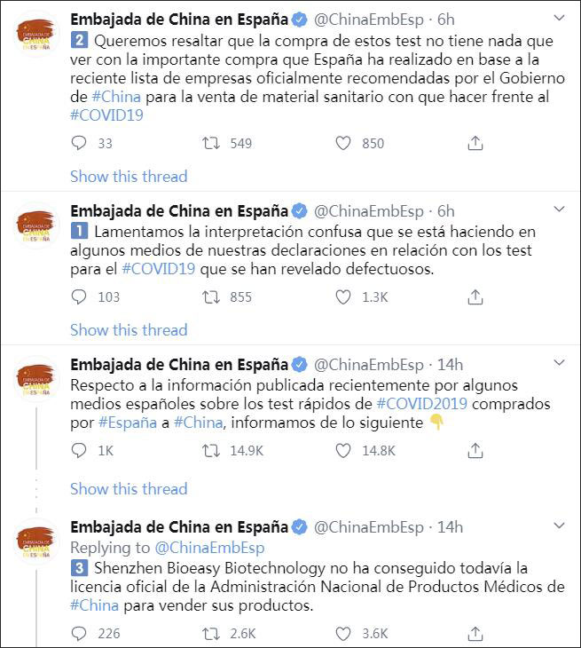 對此,26日,中國駐西班牙大使館連發多條推特予以回應:西班牙媒體報道的這批不達標的快速檢測盒,與中國政府與西班牙達成的4.32億歐元的醫療物資採購合作無關。