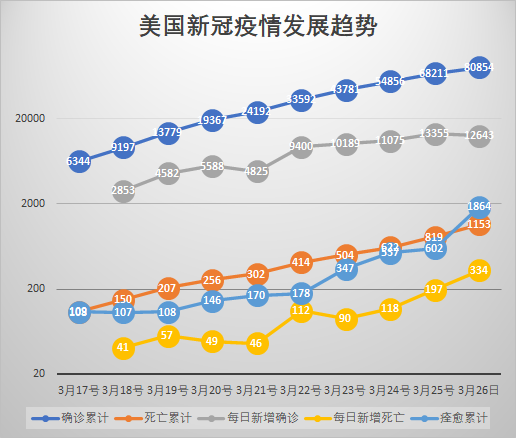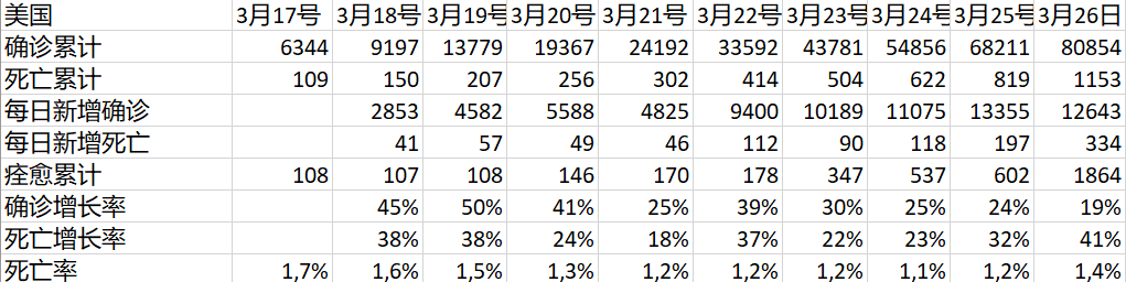 從今天起,把美國提出來單開第一圖。它今天的確診已經超過意大利。就在筆者撰稿的這功夫,它的確診數又漲到82547,已經超過中國還在因輸入疫情輕微增長的歷史記錄,成為名副其實的新冠疫情世界第一名。而且顯然它還有很大的前程,20萬起跳吧。而且美國的疫情啓動比法國還晚很多天,真是後來居上呀!