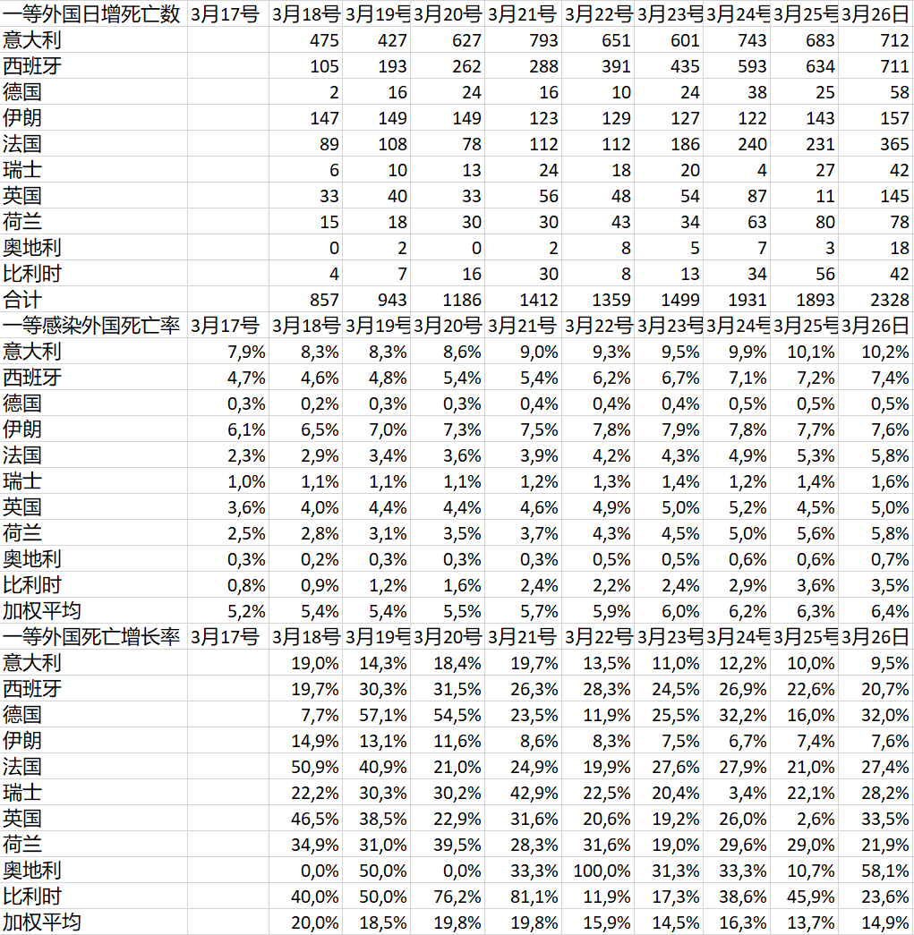 表列的10個歐洲一等疫情國(加美國去伊朗),除了意大利創的是第二高,瑞士有明顯下降外,其餘8個國家,今天都創的是新增最高紀錄!這就意味着,整個西歐,正處於全速上升的階段,一點都沒有減速的跡象。看那個增速%,也是五天來最高。按照現在的平均速度,五天以後,這些國家的整體確診數,就會加一倍從35萬漲到70萬!嚇不嚇人呀?到最前面那幾天的高增速,由於底數很小,是不能作數的。