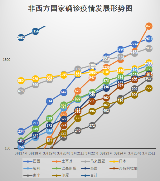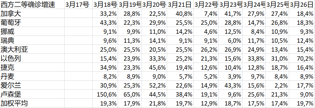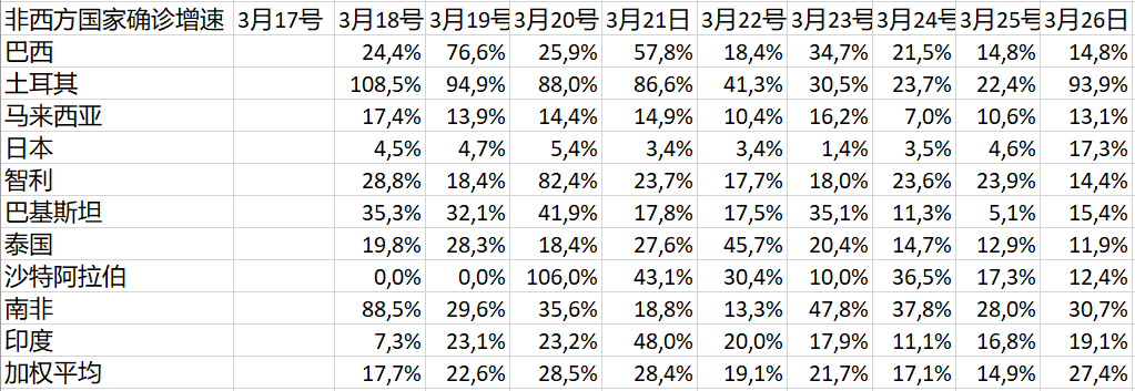 這裏也有奇葩呀!那就是土耳其!它的增速比以色列還要瘋狂!這個國家算西方國家/歐洲國家還是算非西方/非歐洲國家,一直都像蝙蝠一樣模稜兩可。筆者看歐洲已經那麼羣英濟濟,就把它留在了非西方。現在看,明天還是把它送去西方吧,免得壞了其餘非西方估計疫情整體/個體發展速度一直温良恭儉讓的風格。【補註:土耳其的數據今天再核對,沒有錯。今晚把它挪去西方二。照這個速度,今晚,最遲明晚,就能進西方一。】