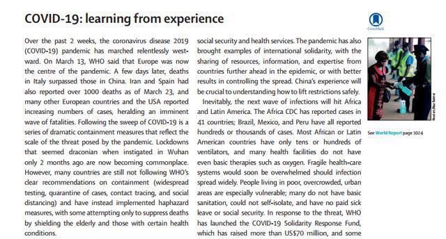 《柳葉刀》雜誌在社論中提醒,下一波感染浪潮將襲擊非洲和拉丁美洲。歐美國家出現的準備滯後情況不可取,無論是希望在其它方面進行遏制,還是出於束手等死的心理,全都無濟於事。國際社會必須利用合作的精神,避免錯誤在更脆弱的國家重蹈覆轍。世界衞生組織也要在協調全球應對疫情方面繼續發揮主要作用。