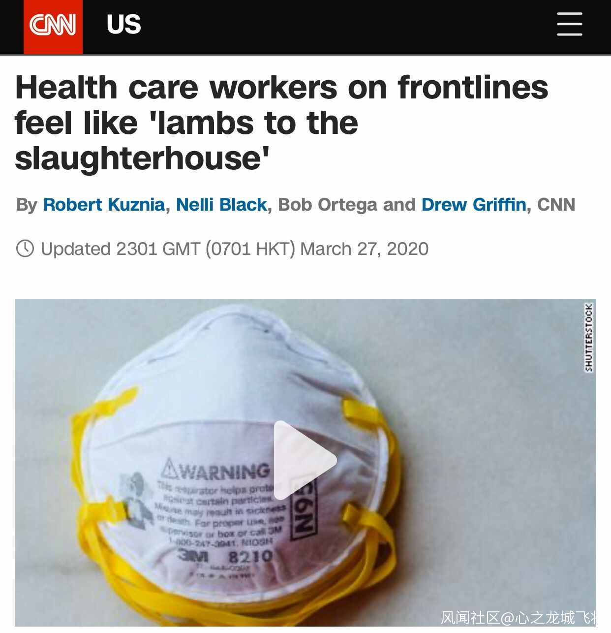【環球網報道 記者 崔舒飛】美國有線電視新聞網(CNN)27日對一篇名為《一線醫務工作者感覺就像‘被送入屠宰場的羔羊’》的報道進行了更新稱,目前全美奮鬥在抗疫一線的醫務工作者們正面臨缺乏醫療防護物資的困境,有人不得不從拍賣網站自購口罩,有人轉向通過社交媒體求助,還有人稱自己和同事被禁止戴口罩以免傳播焦慮情緒……甚至有醫務人員形容“感覺就像被送入屠宰場的羔羊”。