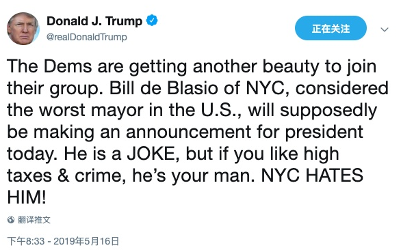 實際上,白思豪曾宣佈參加2020年總統大選。他曾公開表示,特朗普已經為非作歹好一段時間,我知道怎麼對付他。而特朗普則在推特上説白思豪是全美最糟糕的市長,他就是個笑話。