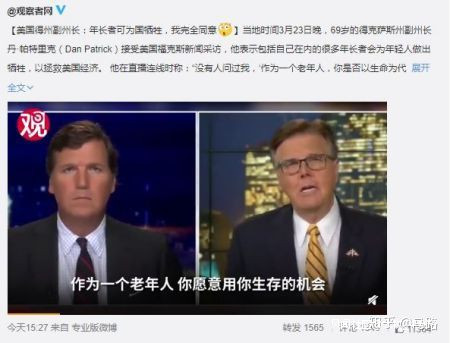 圖片來源:微博@觀察者網犧牲老人保經濟、保年輕人,真不愧是被社會達爾文主義思潮席捲過的美國。不知道Dan Patrick在此之前有對多少老年人進行過統計調查,若只是自己的一廂情願,身為公職人員,在鏡頭前能説出這種話,無異於將美國老年人羣體架在火上進行道德燒烤。在民間、官方,之所以會開始出現類似言論,來源於一些冷冰冰的數據。