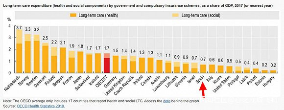 據經濟合作與發展組織(OECD)2019年公佈的數據,西班牙在長期護理上的總費用(政府和強制性保險)僅佔GDP的0.7%,遠低於盧森堡、斯洛文尼亞等國。