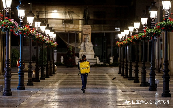 3月15日,在西班牙馬德里,一名送餐員騎着電動滑板車送餐。新華社 圖 我知道病毒會傳到西班牙來,但不知道會從意大利過來
