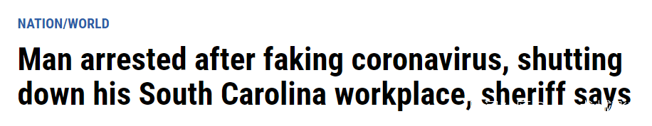 3月19日,據KTLA報道,南卡羅萊納州一名男子週四被警方逮捕,此前有關部門表示,該名男子謊稱自己感染了新冠肺炎,致使工作場所關閉了五天。