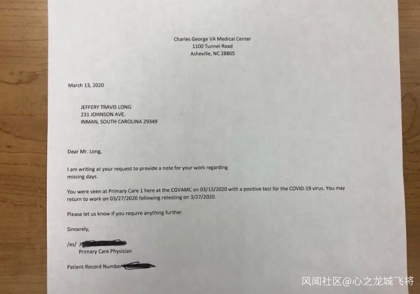 斯帕坦堡縣治安官查克•賴特表示,英曼公司的傑弗裏•特拉維斯•朗出示了一張日期為3月13日的假醫生證明,上面寫着他的新冠病毒檢測呈陽性,將不得不休假2周。