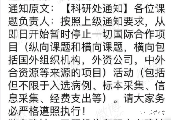 另一家醫院發佈了類似通知:按照上級通知要求,從即日開始暫停一切國際合作項目(縱向課題和橫向課題,橫向包括國外組織機構、外資公司、中外合作資源等來源項目)活動(包括但不限於入選病例、標本採集、信息採集、經費支出 等),請大家務必嚴格遵照執行。