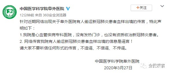 晚間,中國醫學科學院阜外醫院發表聲明稱:網絡傳言我院有人偷運新冠肺炎患者血樣出境的信息是謠言,聲明提到“我院是心血管疾病專科醫院,沒有發熱門診,也沒有資質收治新冠肺炎患者。”