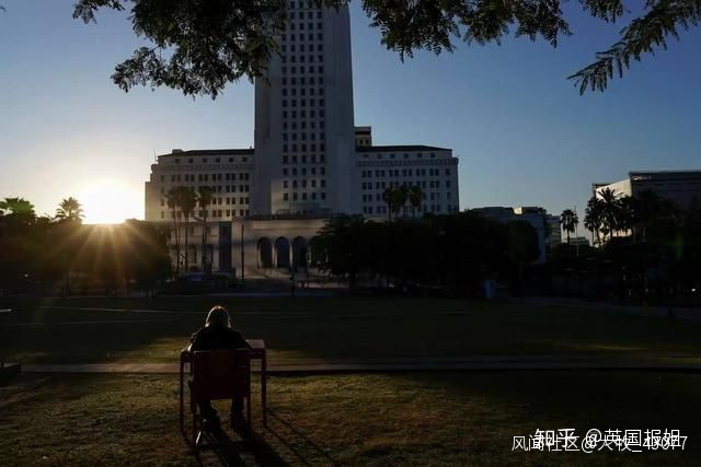 無家可歸的人坐在洛杉磯市政廳前