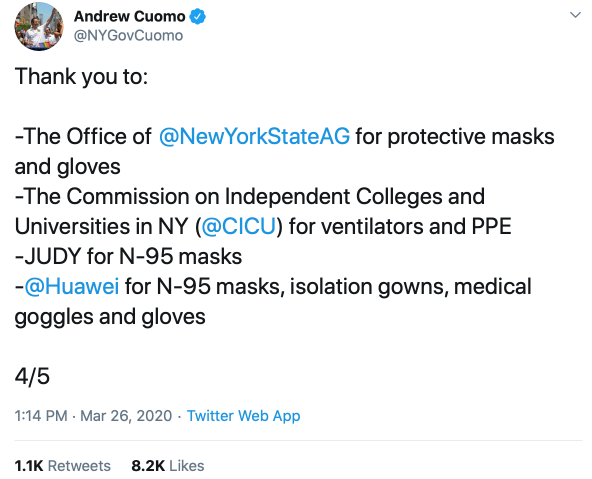 值得一提的是,在這份企業捐贈名單中,令人意外地出現了一箇中國企業的身影:華為。華為向紐約州捐出了1萬個N95口罩、1萬個手套、2萬件防護服和5萬個防護鏡。庫默州長在推特上專門點名感謝了華為。雖然華為的捐贈量並不突出,但考慮華為在美國的實際處境,這一捐贈應當沒有考慮什麼回報。