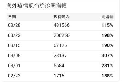 看海外累計確診每週增幅,最高300%翻四倍,上兩週翻三倍也不少。