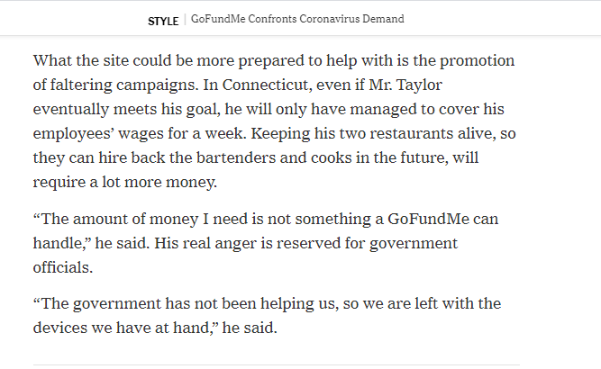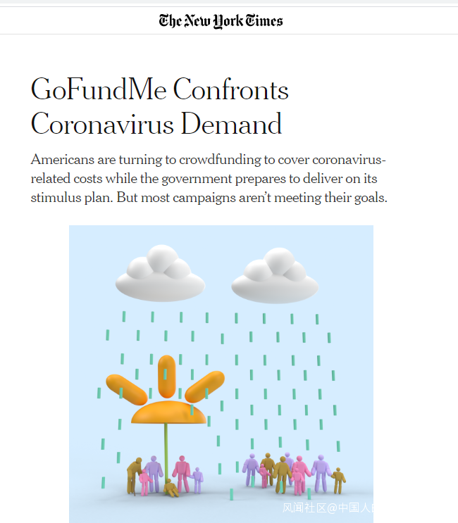 然而,令所有人沒想到的是,就在13天后的3月26日,美國《紐約時報》在其一篇正經的新聞報道中卻表示,GoFundMe這個美國最大的眾籌平台,真的開始被大量美國人用來尋求解決由於新冠病毒疫情所導致的各種經濟困難了——而且,大多數眾籌目前都遭遇到了籌不夠錢的情況。
