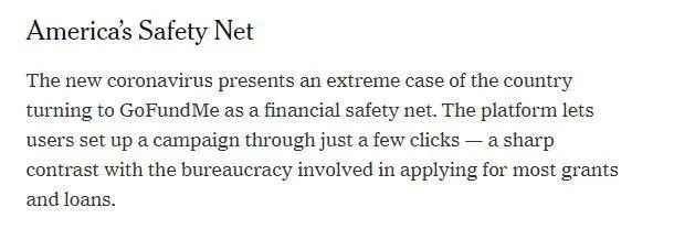 《紐約時報》還在這篇報道中將GoFundMe稱為了“美國的安全網”,稱比起傳統申請貸款時要面對的那些官僚主義的繁瑣手續,這個眾籌平台只需要點幾下鼠標就可以設立起一個求助頁面,因此該平台也成為了美國人在應對疫情以及其他災難時的“金融安全網”。