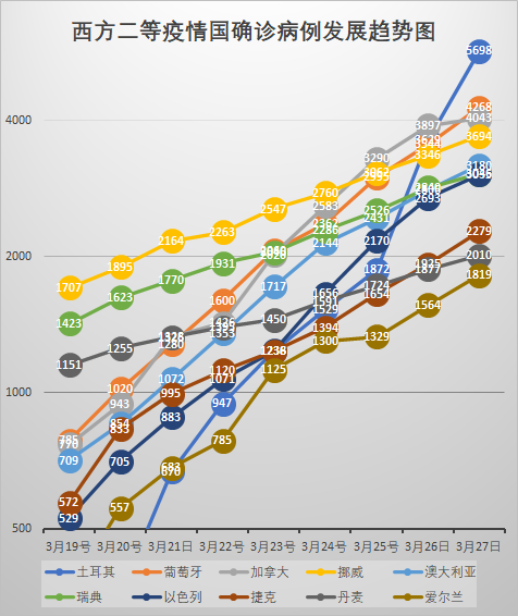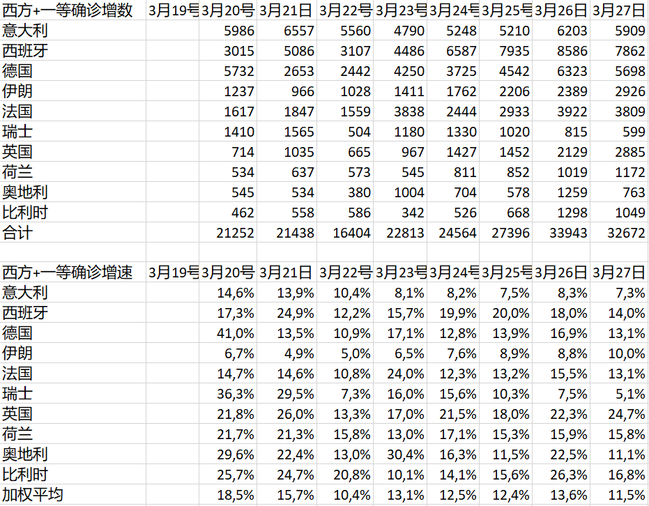意大利的新增數是第三高,盤旋的部位還是太高,雖然從增比看又在下降。22-23號的急降沒能持續。照現在這個高位波動的態勢,就不知道何時能到第二個峯值了。這個看來得等到下降趨勢明顯確定後再重新計算了。