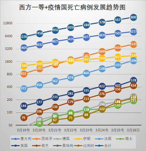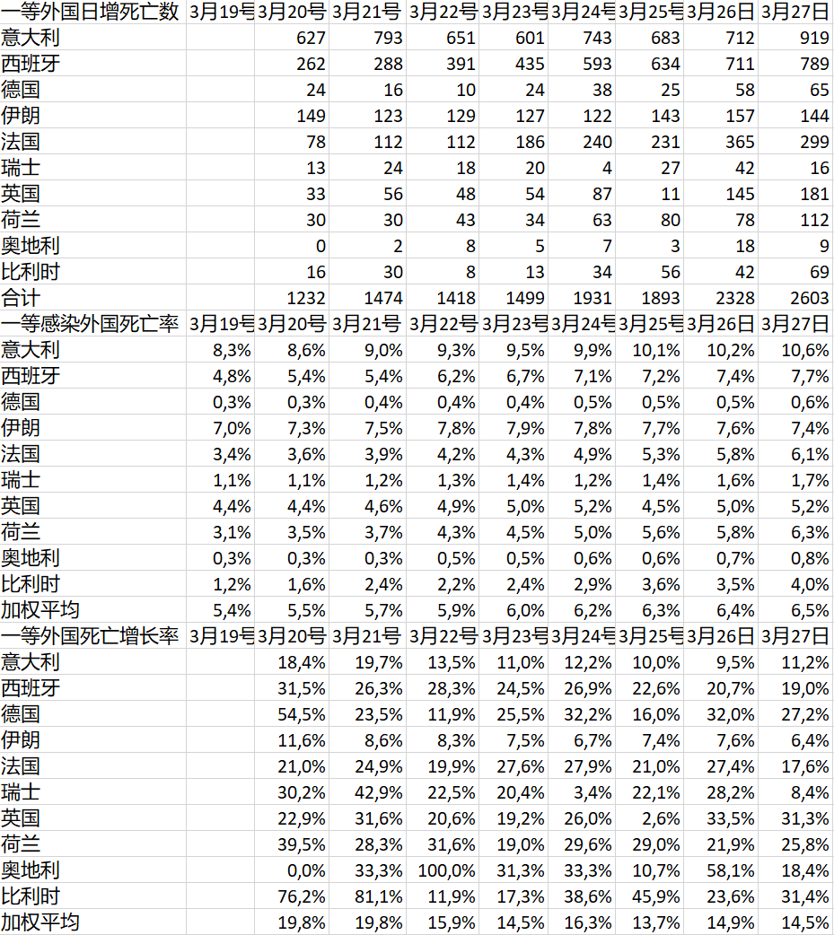 至於死亡數的增幅,只有伊朗和瑞士好看。相對而言,意大利還算好的。這和它的位置太高有關。其它七位,死亡率的增速都高過新增確診的增速。這是它們還在上漲期的標誌。