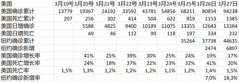 美國今天的確診又加了13384,是新高,但只比前天的紀錄多29例。累計就達到驚人的9.4萬!(撰稿完畢,就已經超過10萬!)看樣子日增一萬的進度會維持相當一段時間的。不過看增比,還是有降。比如到了累計20萬時,還是日增一萬,那增比就只有5%了。那也是勝利在望呢。怕的就是,日增數也呈幾何級數遞增,那就沒有頂了。美國死亡人數有減,死亡率緩慢增長。這些都還正常。