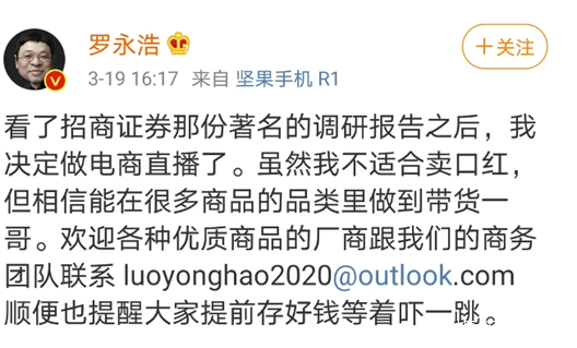 這個懷揣“改變世界”理想的東北男人,在殘酷的現實面前不得不低下那顆“講情懷”的高貴頭顱,“為了掙你們的臭錢”,正式進軍直播帶貨行業。3月19日,羅永浩在微博中宣佈將變身電商主播,並尋找商品廠商合作。