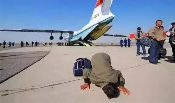 工人馮克榮乘軍機回國後激動地親吻祖國大地(資料圖)