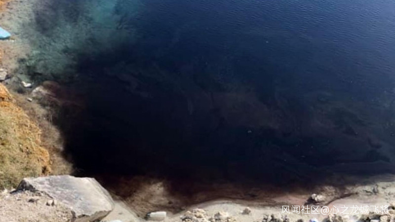 公佈的圖片顯示,兩名穿防護服的警察走到湖邊,把黑色顏料倒進湛藍清澈的湖裏,在湖面形成大片墨痕。