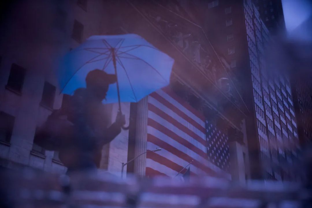 ▲3月17日,美國紐約證券交易所門前的積水中倒映出一名行人走過的身影(180度倒轉)。(新華社發 郭克 攝)