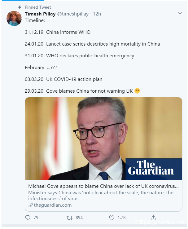然而,不少英國網民卻並不認可他這番推卸責任,甚至“甩鍋”給中國的言論。在境外的社交平台推特上,一位名叫Timesh Pillay的英國醫生就用一則清晰地時間線諷刺了戈夫的言論。這個獲得1600次點讚的時間線,清楚地顯示早在2月之前,中國的疫情規模和嚴重程度就已經被世界衞生組織和醫學家所知曉了。可在2月整整一個月的時間裏,英國政府卻沒有采取任何有效的應對疫情的策略,沒有進行足夠的準備工作。直到3月3日,英國政府才宣佈了抗擊疫情的計劃。