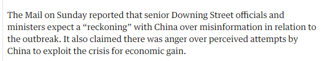 《衞報》還透露説,有消息稱英國政府內部的資深官員和部長正準備和中國“清算”關於新冠疫情的“不實信息”。該消息還稱這些英國官員對於中國“利用疫情獲取經濟利益”感到憤怒。