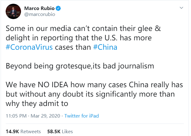 而在如今美國的新冠病毒確診人數成為全球最多之後,美國最反華的共和黨議員盧比奧,更是一邊指控美國媒體“通中”,説美國媒體對於美國的確診病例數比中國多“幸災樂禍”,一邊則“自相矛盾”地表示“儘管我們不清楚中國到底有多少病例,但毫無疑問的是中國實際的確診數字肯定遠多於他們承認的數字”。