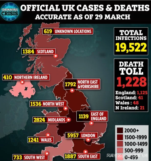 據悉,29日英國新增2433例新冠肺炎確診病例,累計確診達19522例;死亡病例從1019例升至1228例,新增死亡病例209例。(海外網 包睿一)
