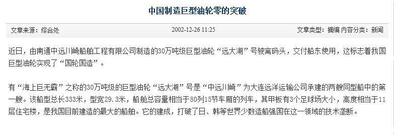 直到2002年,南通中遠川崎船舶工程有限公司製造的30萬噸級巨型油輪“遠大湖”號駛離碼頭,交付船東使用。