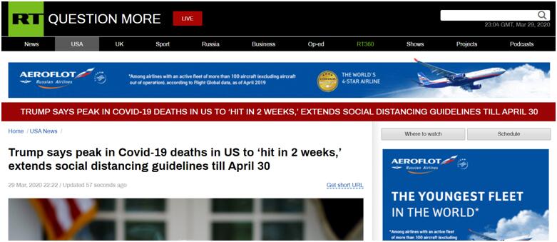**【環球網 張曉雅】**據“今日俄羅斯”(RT)剛剛報道,當地時間3月29日,美國總統特朗普在白宮有關新冠肺炎疫情的新聞發佈會上表示,美國將對有關新冠肺炎疫情的社交距離防疫建議延長至4月底,他還引用模型數據表明,美國新冠肺炎的死亡率可能在兩週內達到峯值。