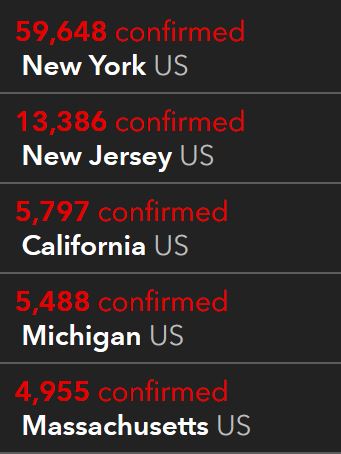 目前,美國疫情最為嚴重的是紐約州,共有確診病例至少59648例。此外,新澤西州有確診病例13386例,加利福尼亞州有5797例,密歇根州有5488例。