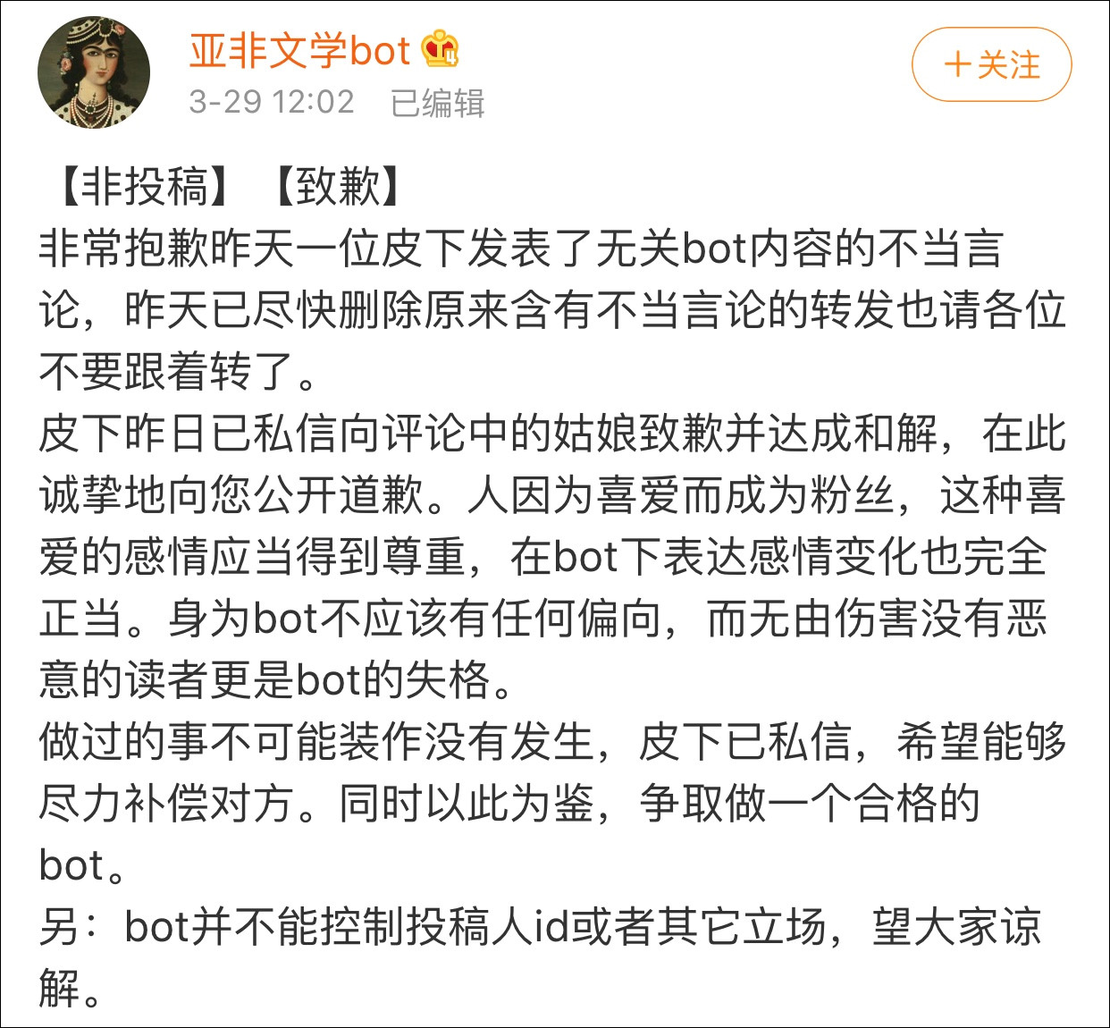 昨天中午,@亞非文學bot 道歉,“稱已私信向評論中的姑娘致歉並達成和解。身為bot不應該有任何偏向,而無由傷害沒有惡意的讀者更是bot的失格。做過的事不可能裝作沒有發生,皮下已私信,希望能夠盡力補償對方。另外,bot並不能控制投稿人id或者其它立場,望大家諒解。 ”