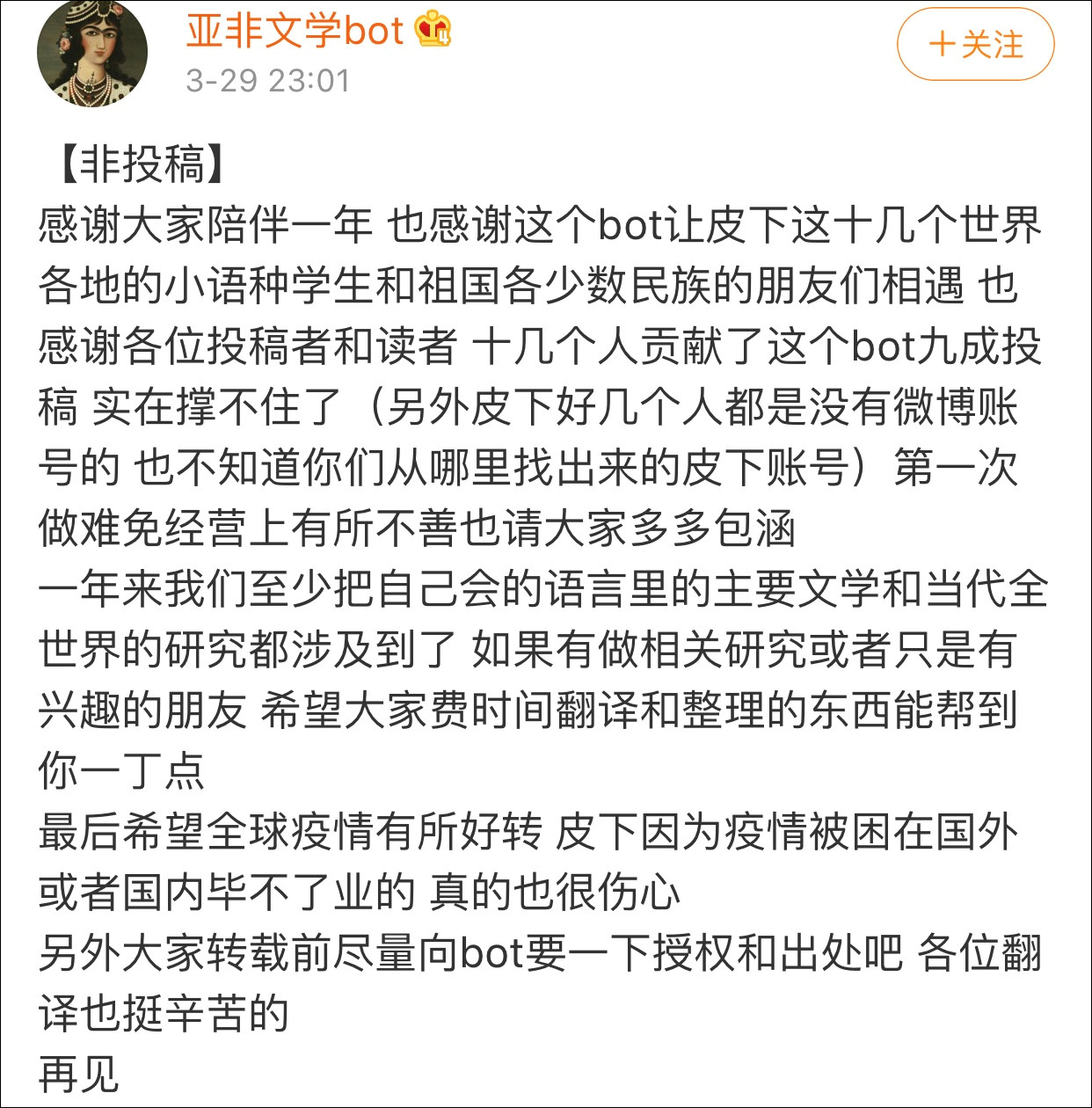 昨晚,專注各地文學翻譯的微博博主@亞非文學bot 發帖表示,感謝大家陪伴一年,現在實在撐不住了,第一次做難免經營上有所不善,也請大家多多包涵。同時,希望全球疫情有所好轉。
