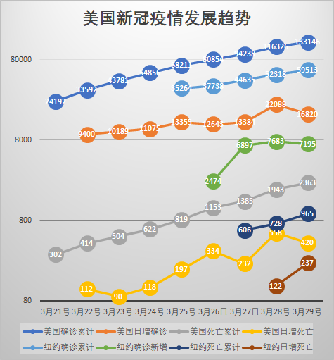 紐約的新增確診也有一點下降。但也是第二高,估計還沒有到真正開始降的時候。紐約州長莫科昨天在人人都聽的簡報中説,紐約州的入醫院和入ICU的人數比前天都有降。希望這是紐約疫情已經開始好轉的確切徵兆。