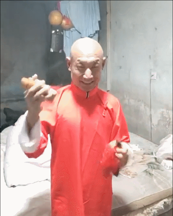 他穿上大褂,打快板,説《玲瓏塔》、《探清水河》,搖頭晃腦,好不開心。