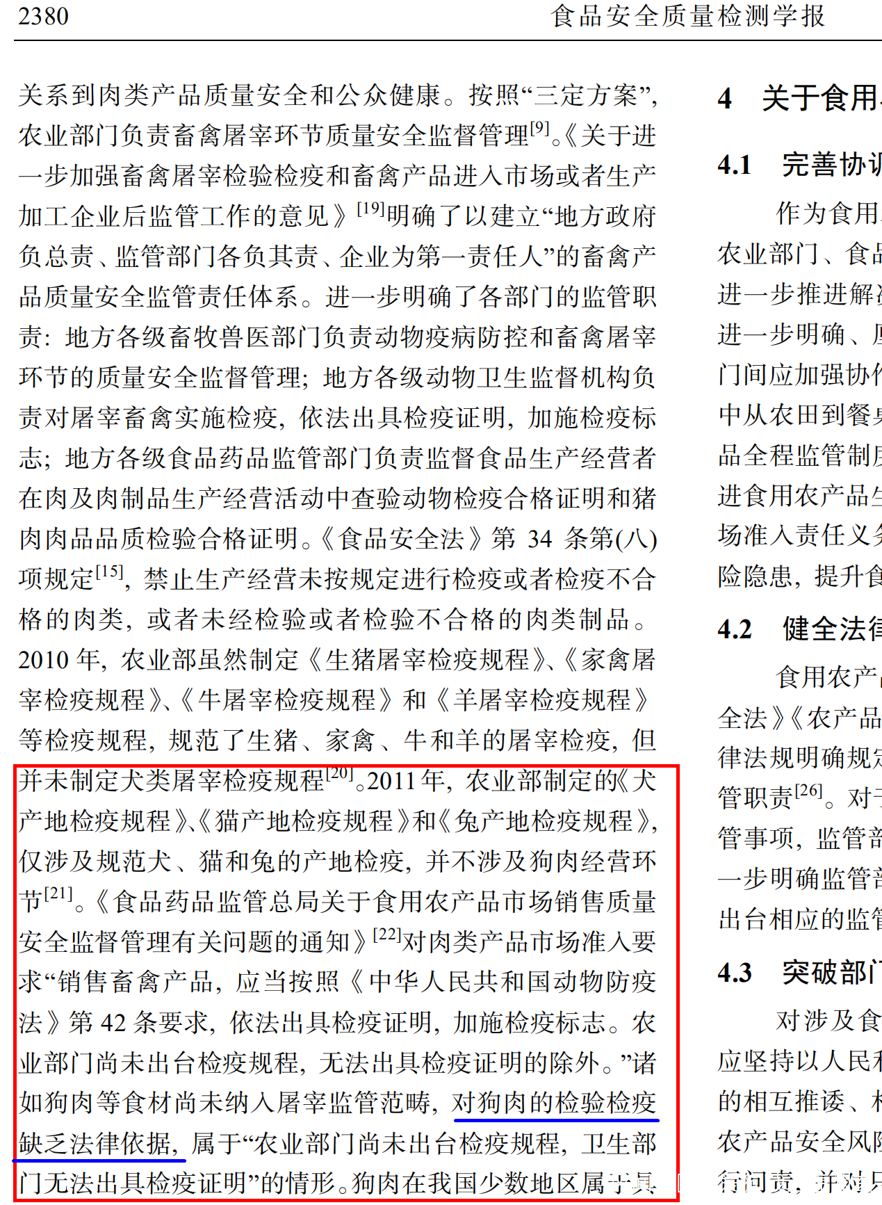 有篇論文寫得非常清楚:“狗肉等食材尚未納入屠宰監管範疇, 對狗肉的檢驗檢疫缺乏法律依據。”論文作者就是專門研究食品安全的專家。