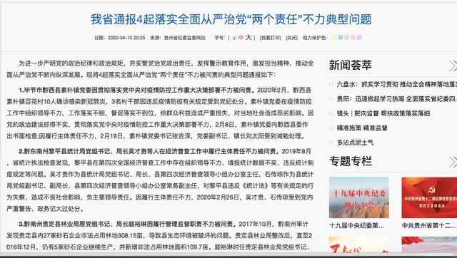 貴州省紀委監委網站4月10日晚通報4起落實全面從嚴治黨“兩個責任”不力被問責的典型問題。其中,因為一個村出現10例新冠肺炎感染者,畢節市黔西縣素樸鎮黨委書記張吉澤,黨委副書記、鎮長劉太陽受到誡勉處理。