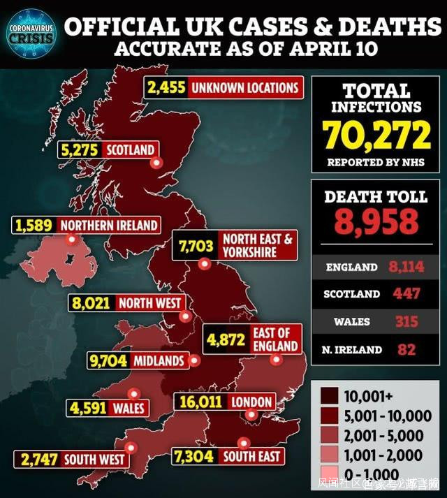 截至4月10日,英國總計有新冠病毒確診病例73758例,死亡病例8958人。英國人口數約為6600餘萬。