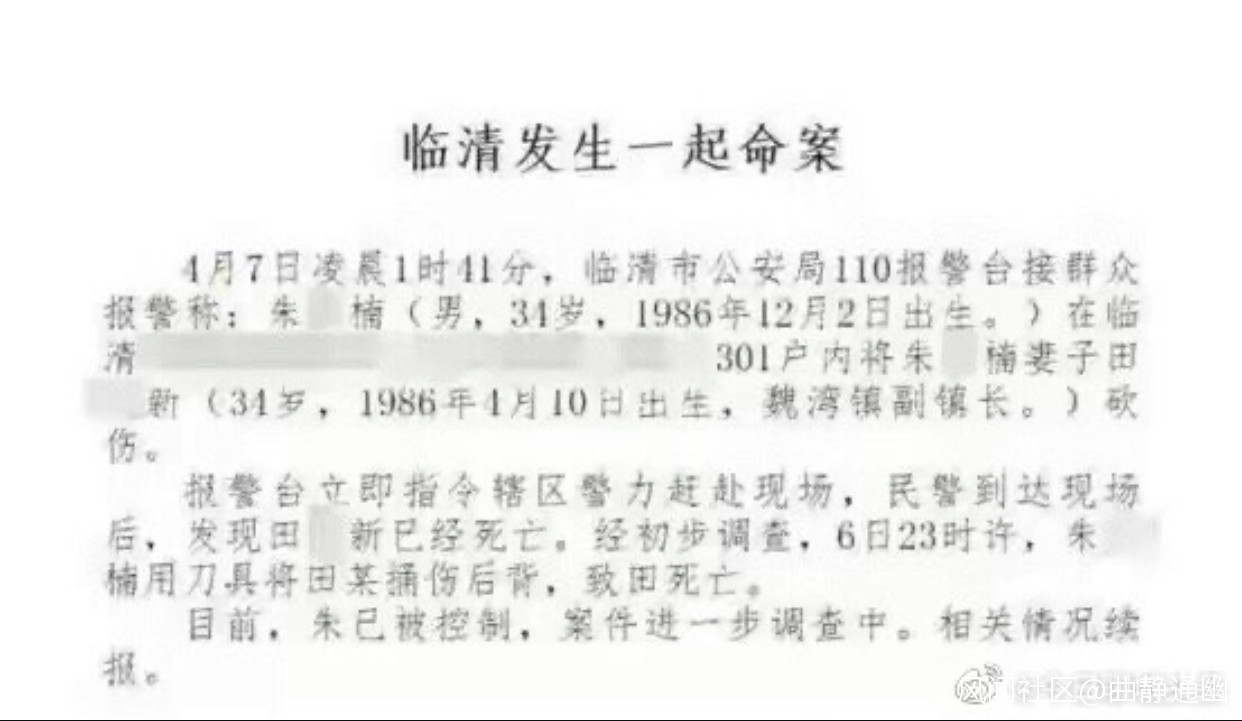 通報顯示,4月7日凌晨1時41分,臨清市公安局110報警台接到羣眾報警:朱某楠(34歲),在臨清市一個回遷小區房內將妻子田某新砍傷。