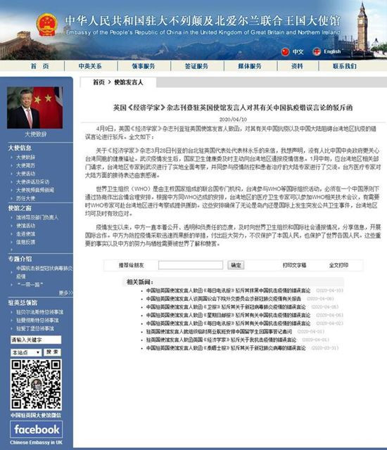 中新網援引中國駐英國使館網站消息,4月9日,英國《經濟學家》雜誌刊登駐英國使館發言人致函,對其有關中國抗疫以及中國大陸阻礙台灣地區抗疫的錯誤言論進行駁斥。