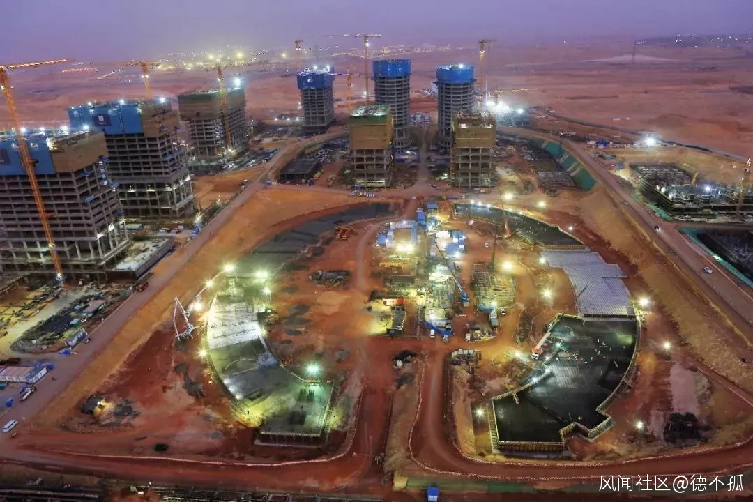 開羅時間2月5日晚23時,埃及新首都CBD項目中心廣場首段7500立方米的大型筏板開盤澆築。圖源:中國建築