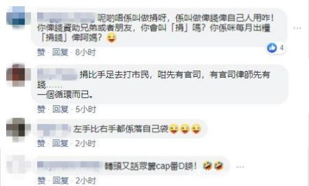 (臉書截圖,下同) 也有市民一眼看穿:“捐給’手足’打市民,這樣才有官司,有官司律師才有錢,一個循環而已……”、“轉眼又説要眾籌,把錢拿回來……”