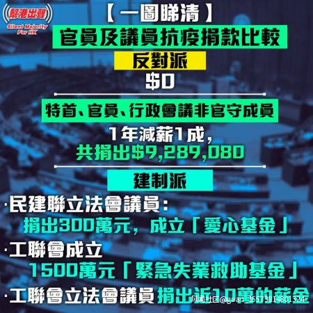 (圖源:“幫港出聲”臉書) 建制派方面也積極響應,民建聯立法會議員已捐出300萬成立“愛心基金”;工聯會成立了1500萬的“緊急失業救助基金”,此外,5位工聯會立法會議員亦各捐出10萬元薪金。