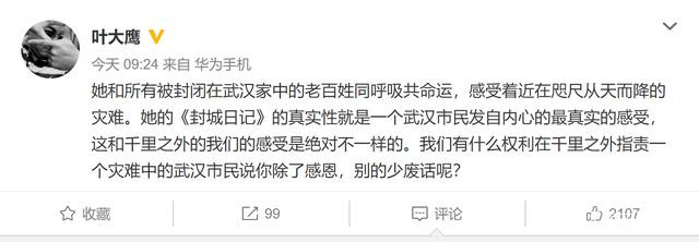在方方日記事件以來,葉挺孫子葉大鷹導演力挺方方,引起圍觀,也同樣有不同的聲音存在,公眾的言論自由,讓圍觀人不吵熱不罷休的心態,最後也有人糟蹋葉大鷹。