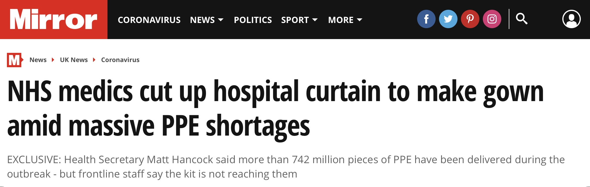 (注:原標題為“NHS medics cut up hospital curtain to make gown amid massive PPE shortages”)