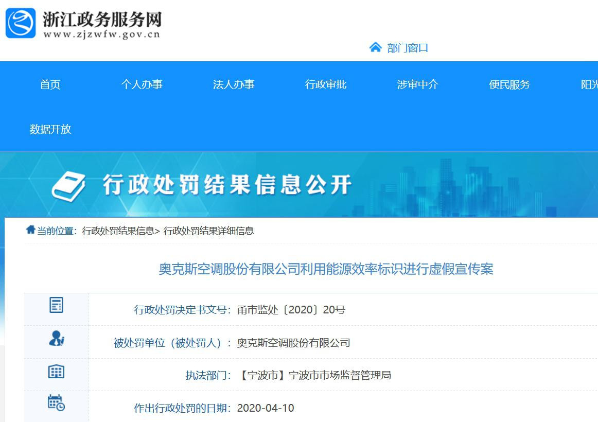 對此,寧波市市場監督管理局責令奧克斯空調股份有限公司改正,並罰款10萬元。行政處罰履行期限為2020年4月25日。(中新經緯APP)